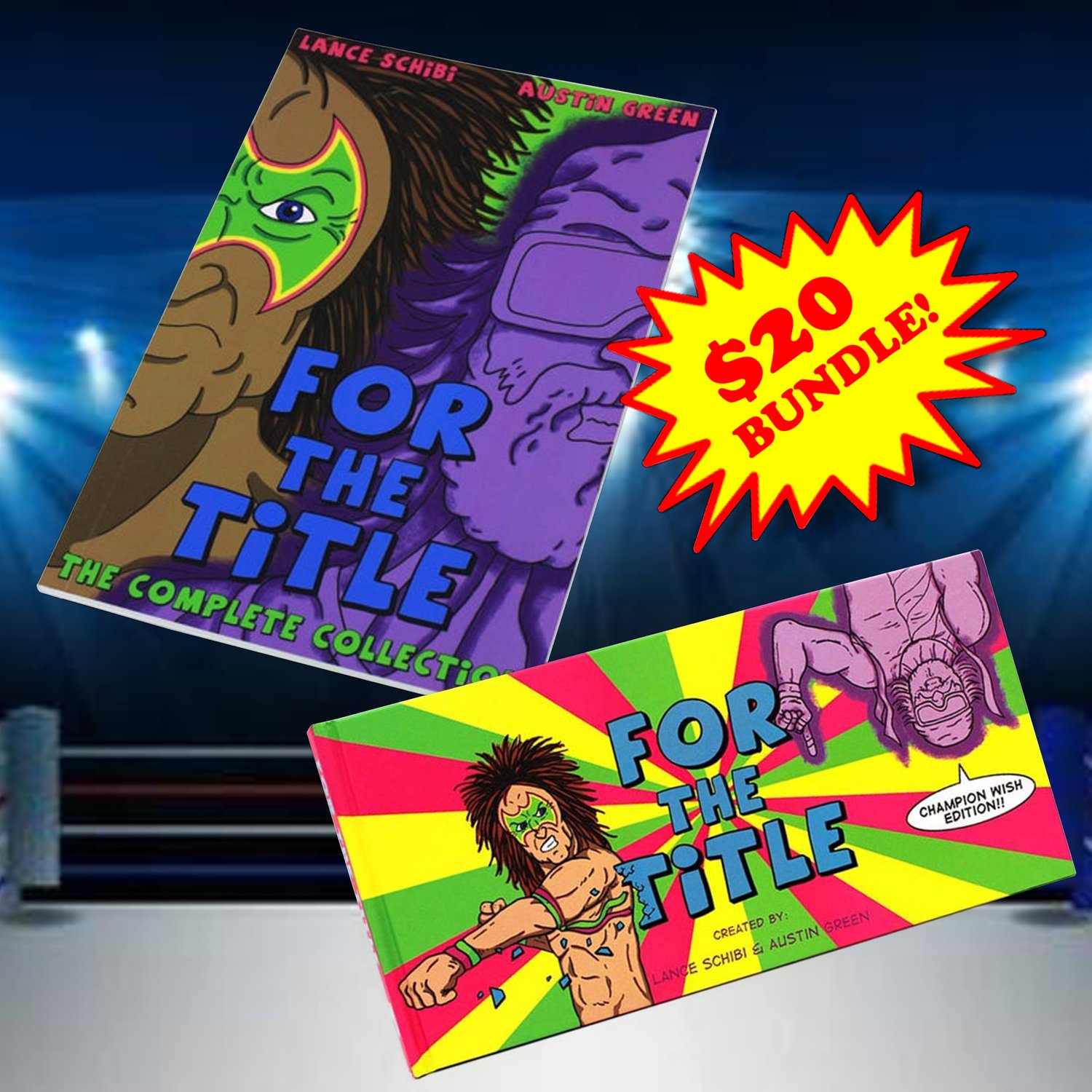 80's wrestlers. Ghosts. Betrayal. Champions. This trade paperback book collects all six volumes of the ongoing FOR THE TITLE web comic! 104-pgs of ridiculous neon fun! Written by Austin Green and illustrated by Lance Schibi, The Complete Collection also includes over SIXTY guest artists including Nick Pitarra, Ramon Villalobos and pro-skater Chris Haslam. Plus an Introduction by pro-wrestler Simon Grimm!